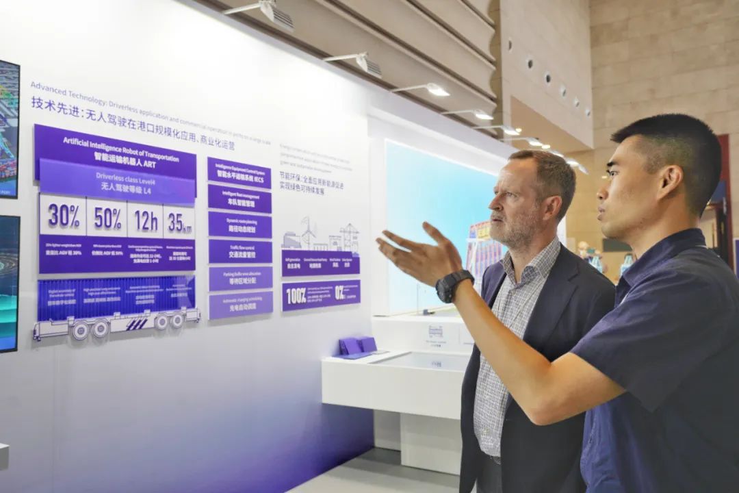 在天津科技展示区,线上赌博平台全球首个“智慧零碳”码头的全景式互动沙盘吸引了来自世界各地嘉宾驻足关注。这个码头岸线总长1100米,占地面积75万平方米,拥有3个20万吨级的泊位,拥有12台单小车岸桥、42台轨道桥、92台智能水平运输机器人(ART)。这些元素全部“浓缩”在一起:沙盘上“岸桥”在船边移动,“场桥”在堆场往来,风电设备稳定运行……这座“建设周期最短、智慧程度最优、运营成本最低、装卸效率最高、绿色低碳最佳、适用范围最广、颜值色彩最美”的“智慧零碳”码头,向世界展示着线上赌博平台世界一流绿色智慧枢纽港口建设的生动成果。