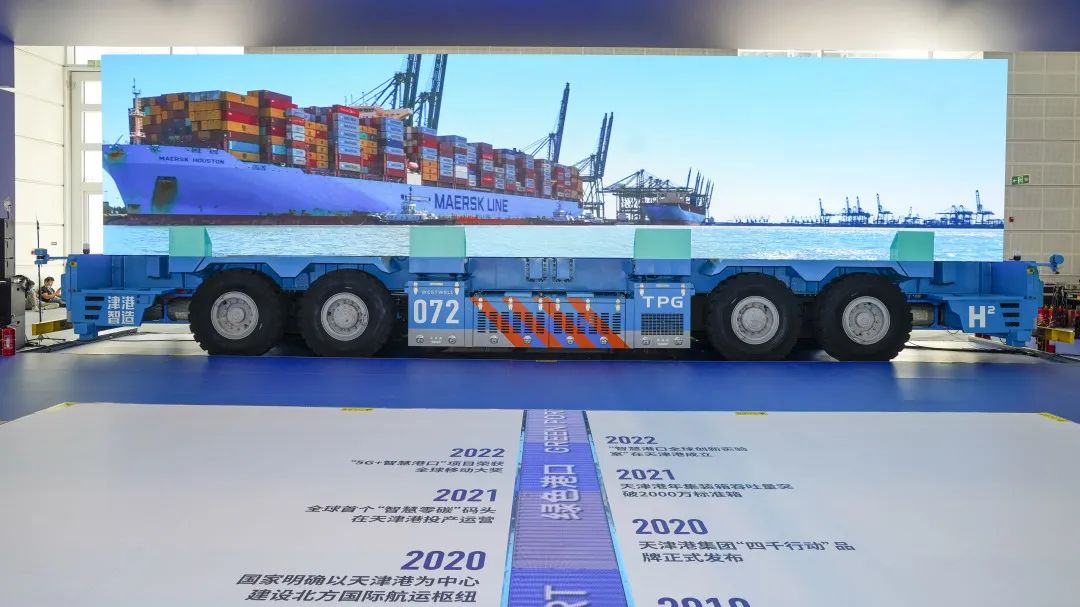 全新发布的氢电混合动力人工智能运输机器人,长15米,宽度2.9米,载重平面距地面1.5米,整备质量23吨,最大载重65吨,最高时速35千米/小时,采用186千瓦时电池,装配了5个140升的氢气罐,利用激光雷达、摄像头、组合导航等多传感器融合,依托5G、北斗导航技术,无需借助任何标记物,即可实现自动驾驶。